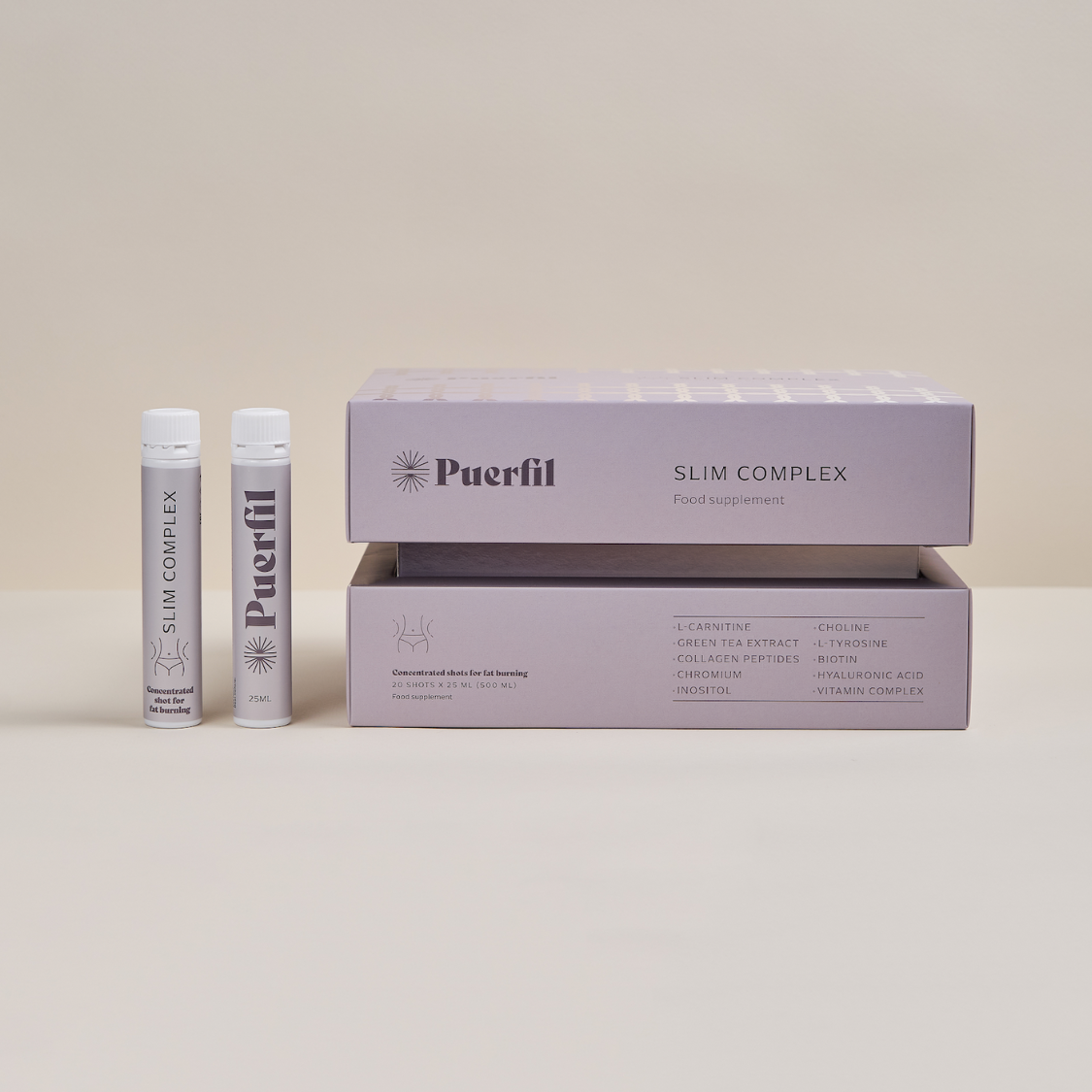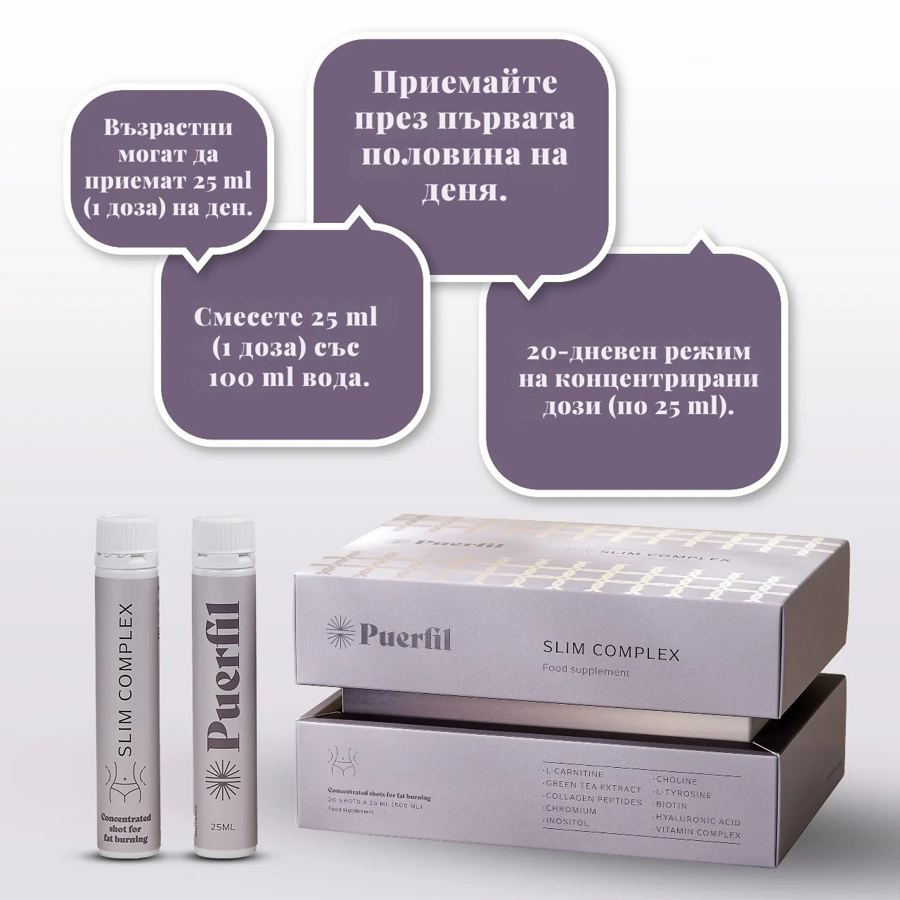 Всички дози трябва да се разклатят преди употреба. Puerfil Slim Complex е течна хранителна добавка и трябва да се смеси 25 мл (1 доза) със 100 мл вода. Препоръчително е да се консумира през първата половина на деня.